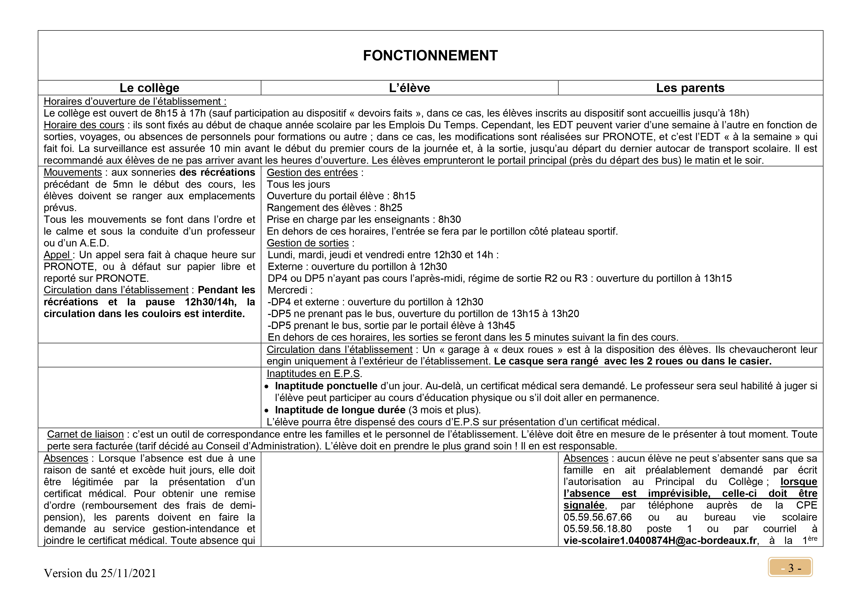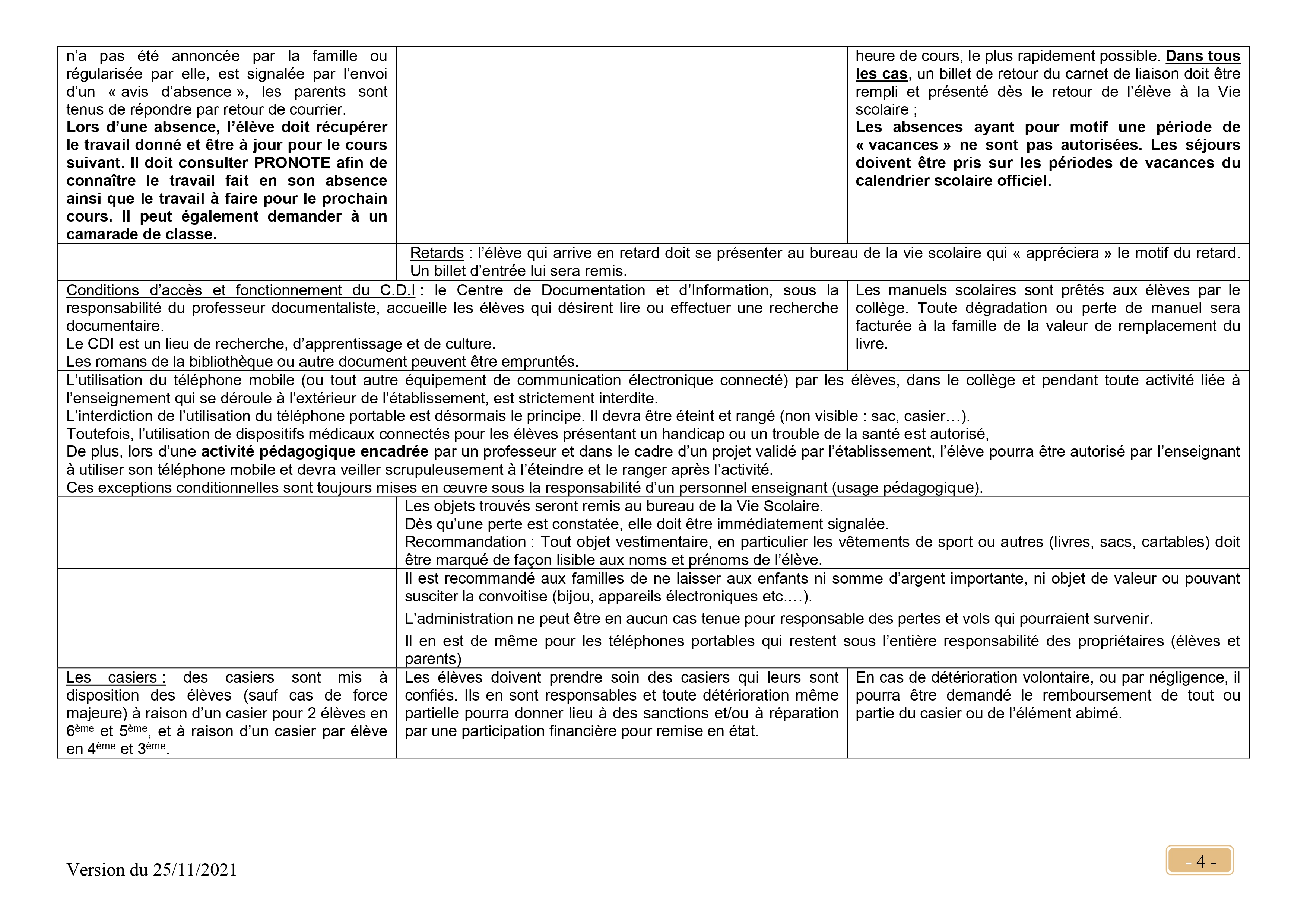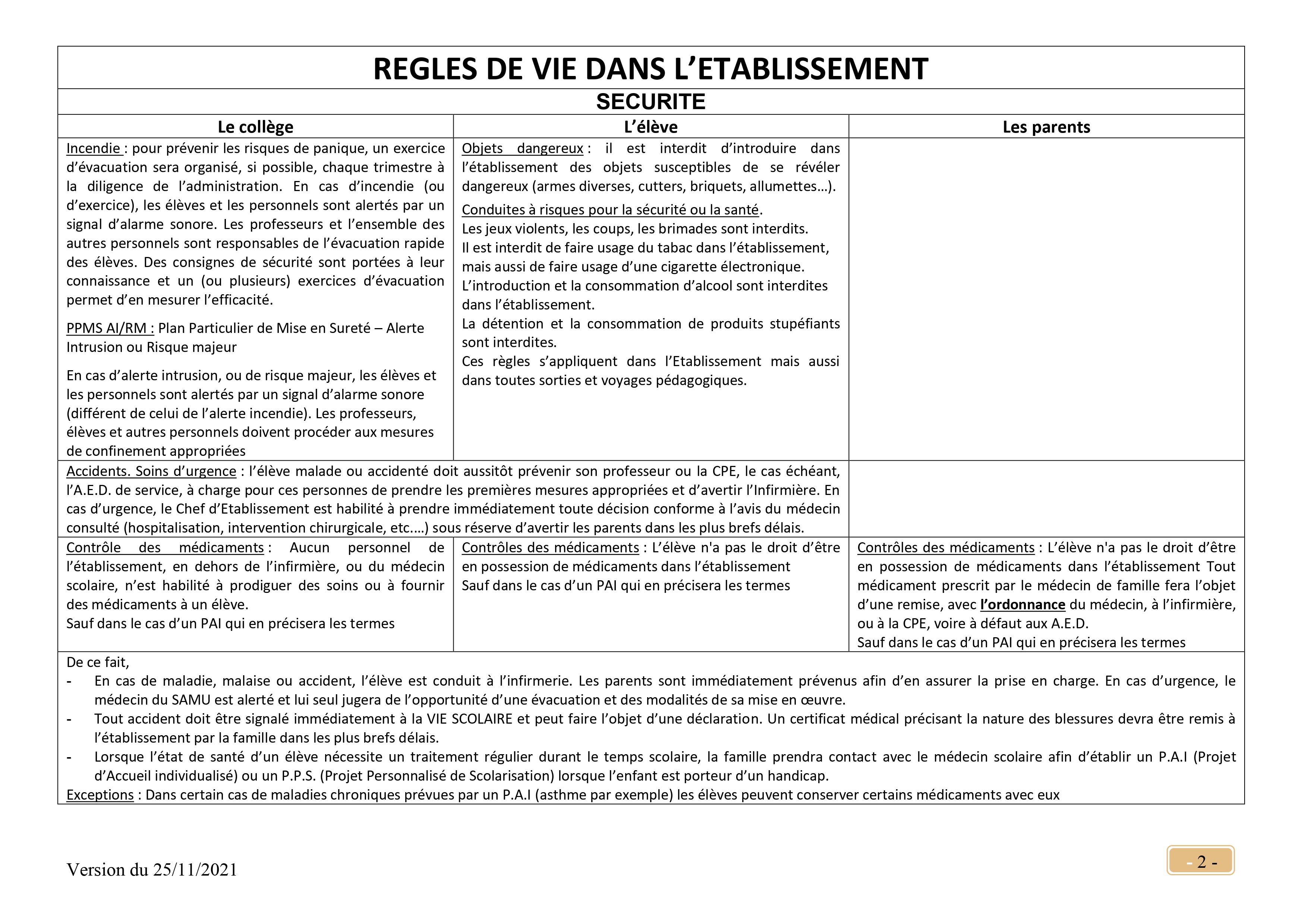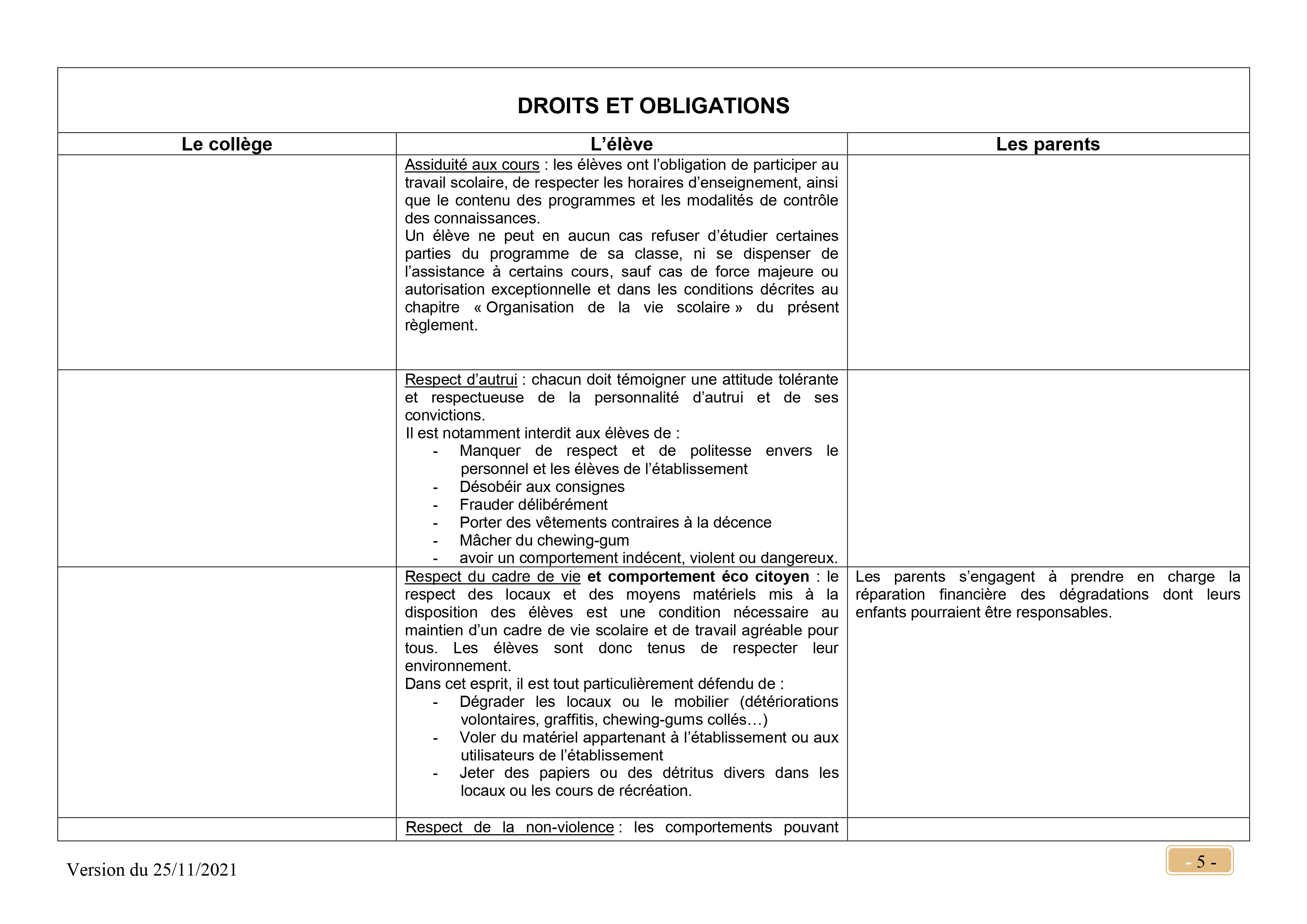 Le règlement intérieur rassemble et fixe l’ensemble des règles de vie dans l’établissement. Il rappelle les règles de civilité et de comportement ainsi que les droits et obligations de tous les usagers du collège (communauté éducative, élèves, parents).