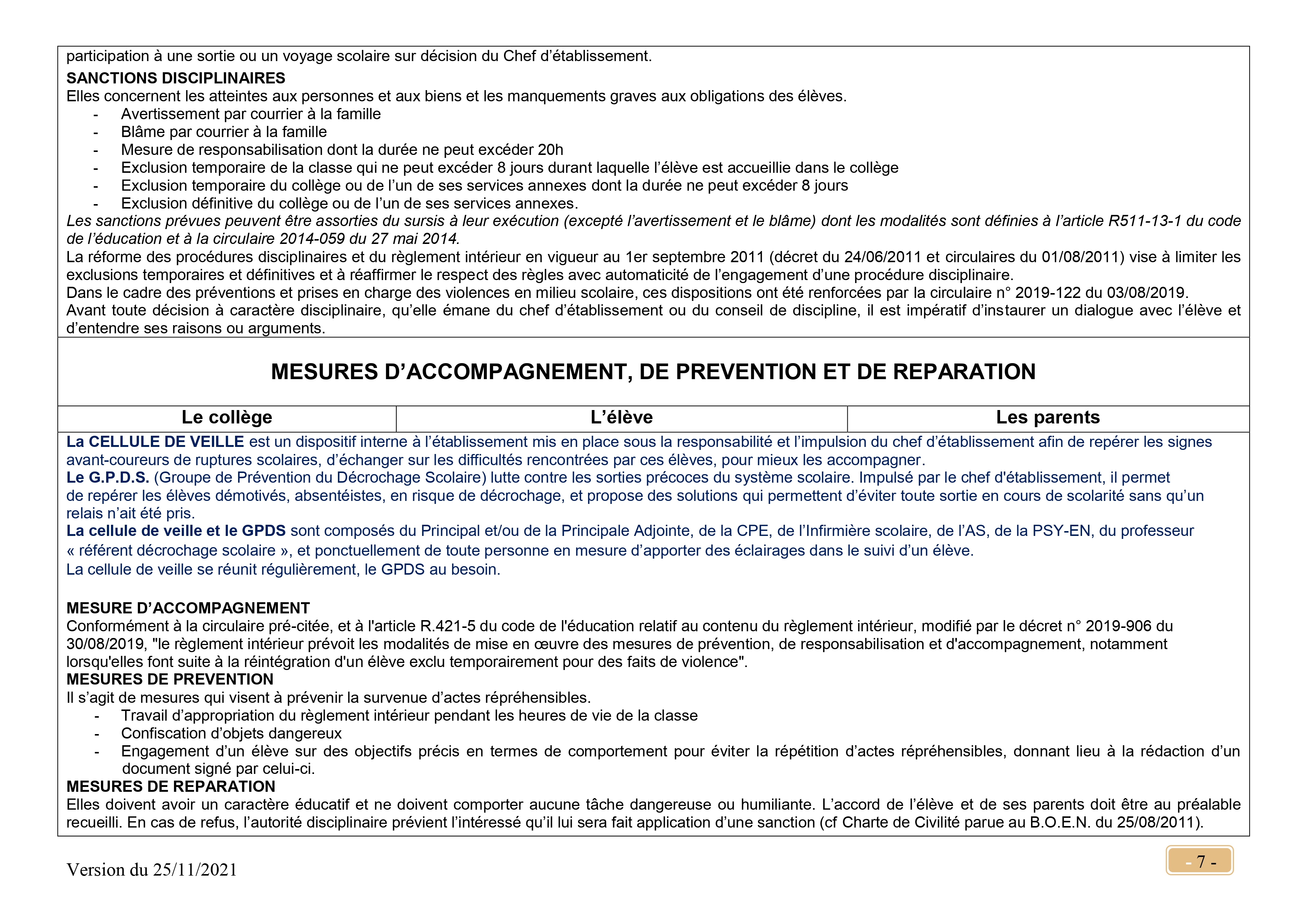 Ce règlement intérieur est renforcé par le décret n°2019-906 du 30 août 2019 relatif à la discipline dans les établissements scolaires.