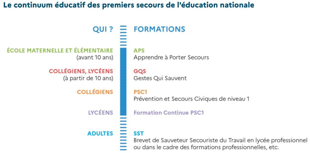 La formation aux premiers secours est obligatoire. La sensibilisation à la prévention des risques et l’enseignement des règles générales de sécurité pour une éducation à la responsabilité répondent à des exigences éducatives de sécurité civile et de santé publique.